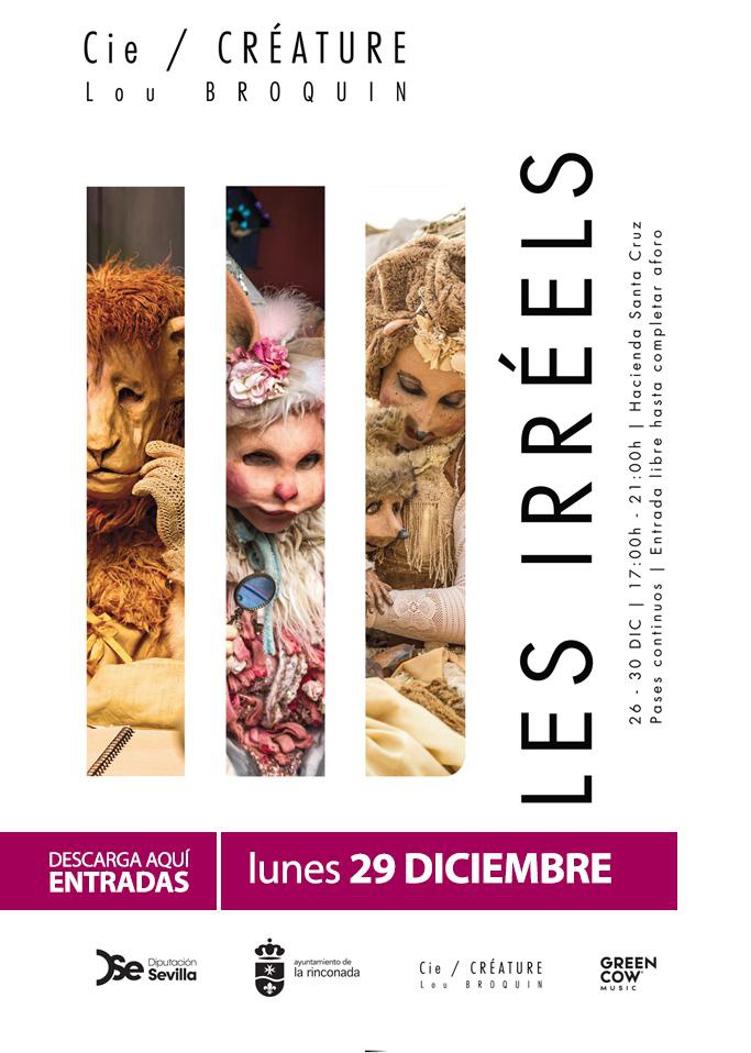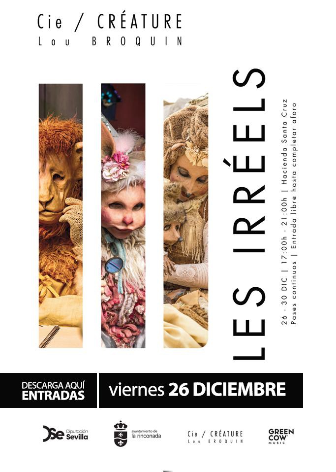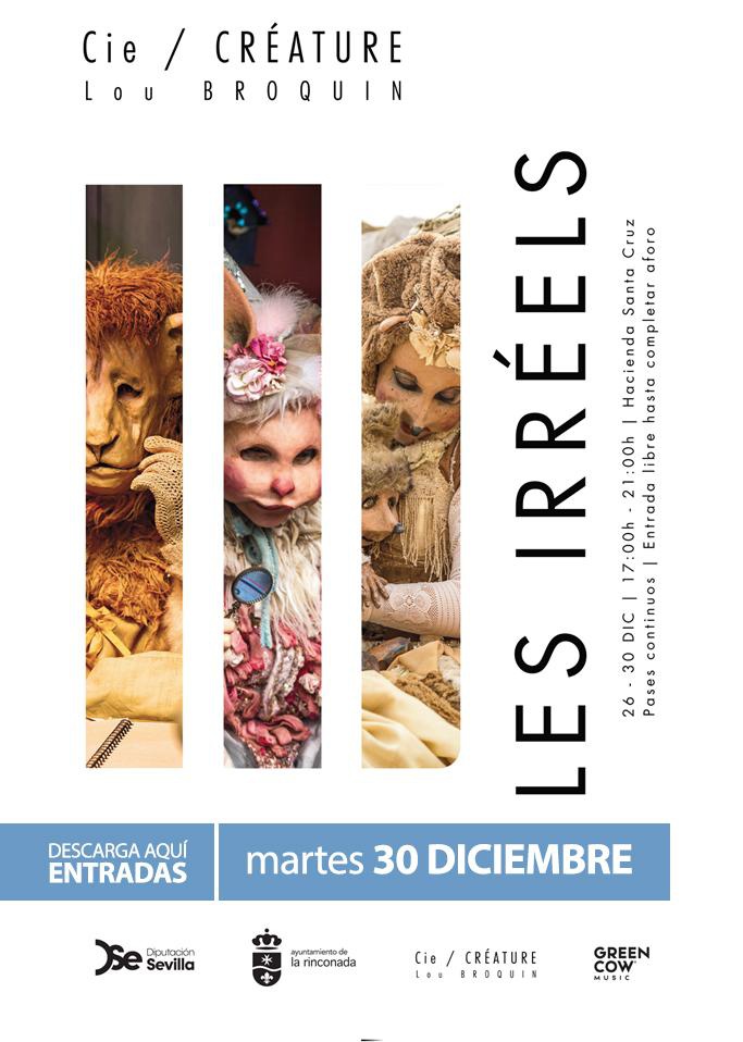 Desde el 26 al 30 de diciembre en la Hacienda Santa Cruz, entre las 17:00 y las 21 horas, con una muestra escénica asombrosa, libre y abierta a todas las personas, donde los sentimientos vuelan como resultado de emociones mágicas y transformadoras transmitidas por unos actores animales (son mucho más que híbridos o criaturas) fascinantes, que durante cuatro horas diarias cuidan de los suyos y de nosotros con la habilidad de que sintamos la esencia de nuestra propia existencia. En lo que nos beneficia y en lo que nos perjudica, y siempre con ternura. Esta performance sin palabras se aloja en el corazón de la ciudad y del día a día de cada uno, proponiendo un momento suspendido entre la reflexión y lo imaginario para acercarnos a nosotros mismosLa compañía francesa descubrirá un campamento repleto de seres irreales, que conforman toda una civilización paralela, extraña, pero cercana. Les Irréels forman un pueblo paralelo a los humanos. No sabemos si se trata de una civilización milenaria, de una tribu futurista o de una especie desconocida. Sus ocupaciones son como esperanzas tendidas hacia el mundo que nos rodea. Cada uno de ellos trabaja para el ensueño y los estados del ser. En un campamento de cabañas, Les Irréels evolucionan en universos plásticos fuertes y singulares